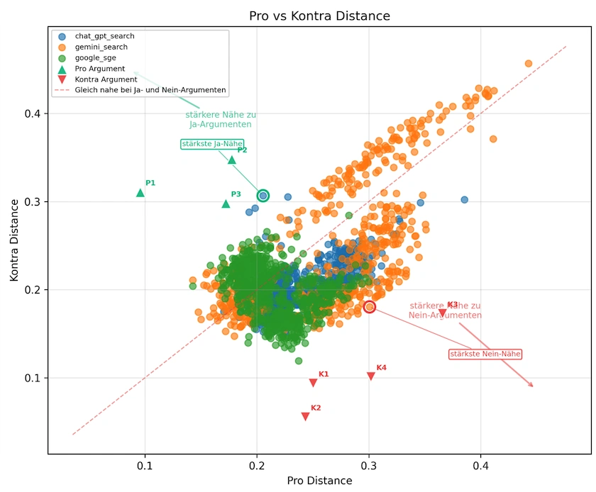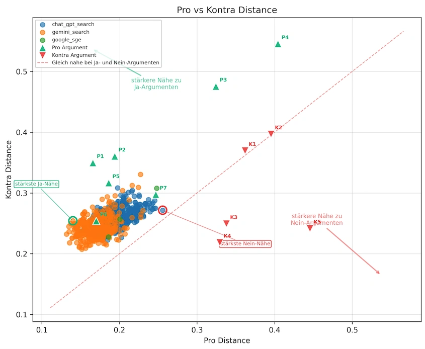 Jeder Punkt in der Grafik steht für eine KI-Antwort. Die Position einer Antwort zeigt, wie stark diese Antwort den Argumenten der Befürworter oder Gegner ähnelt.